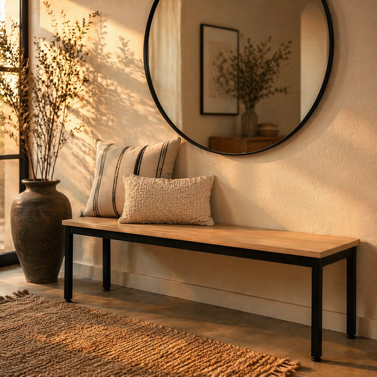 La Banca Heimish de Madera de Acacia Natural es una pieza pensada para aportar calidez, textura y funcionalidad a distintos espacios del hogar. Su largo de 150 cm la convierte en una opción ideal para comedores, pies de cama o recibidores, entregando presencia sin sobrecargar el ambiente.