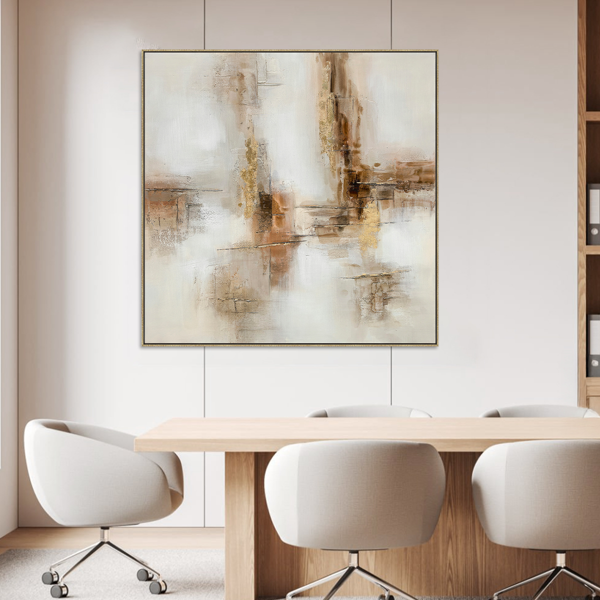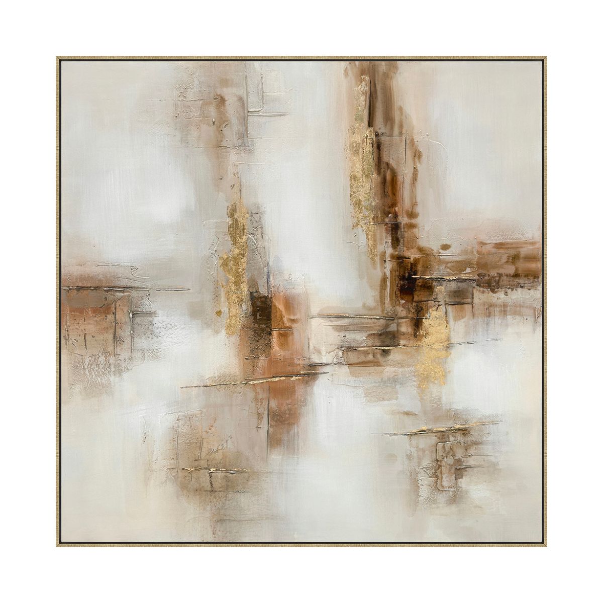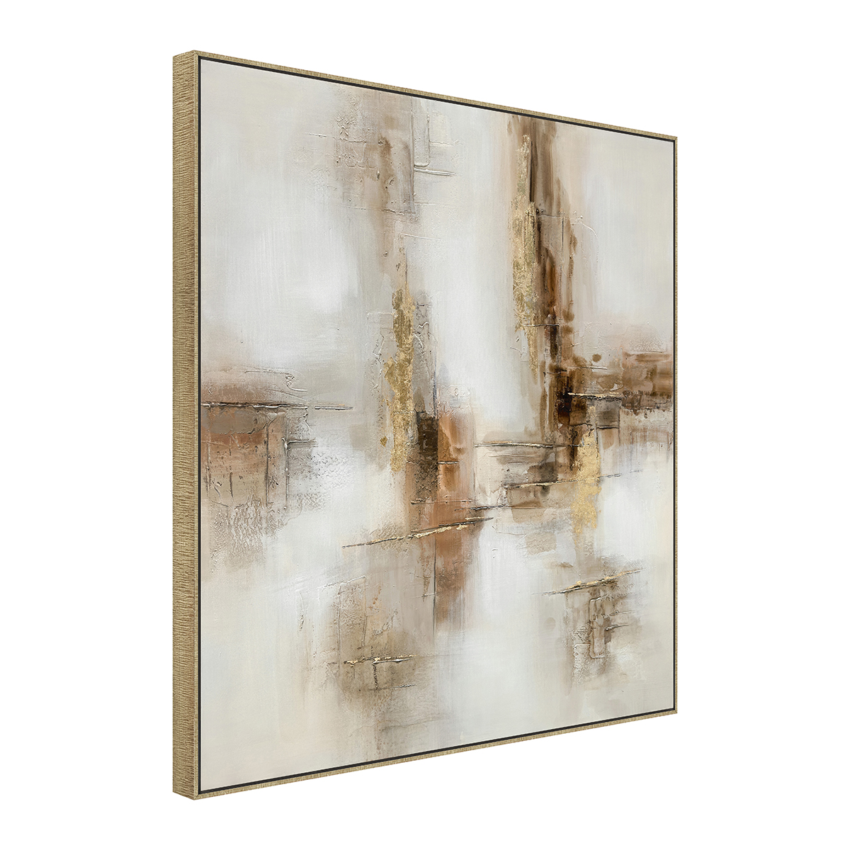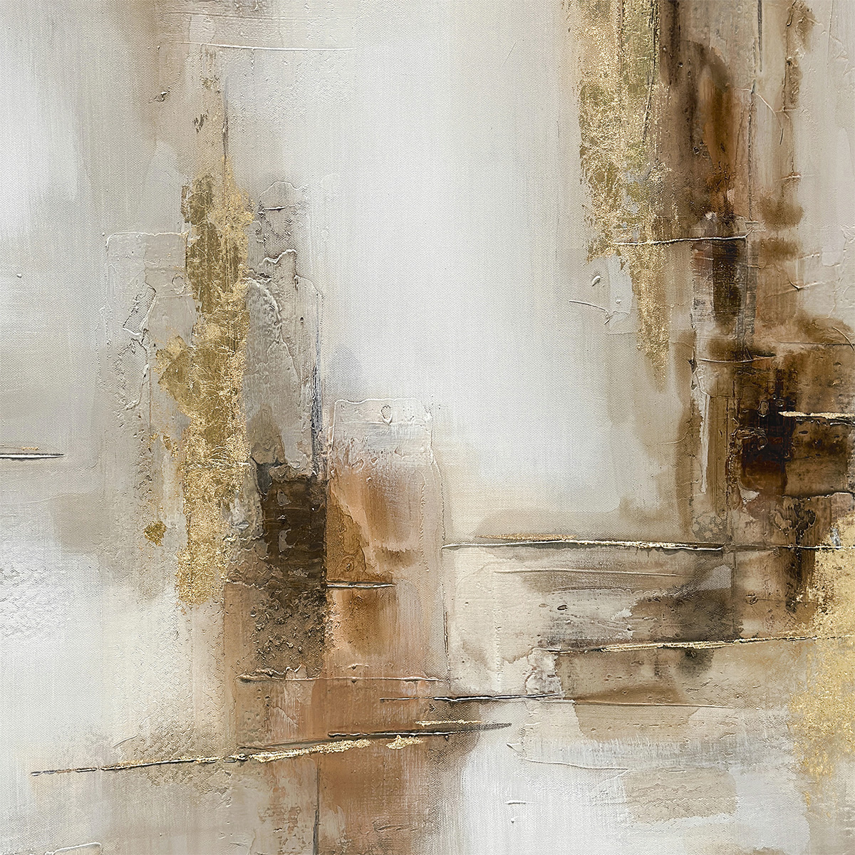 Obra pintada a mano sobre canvas HD, que combina tonos blanco y beige en una composición abstracta que sugiere formas naturales y contornos suaves. “El Cañón” transmite calma y elegancia, mientras el marco dorado aporta un acento cálido y sofisticado. Ideal para realzar espacios modernos, clásicos o de estilo neutro que buscan arte con presencia y equilibrio.