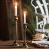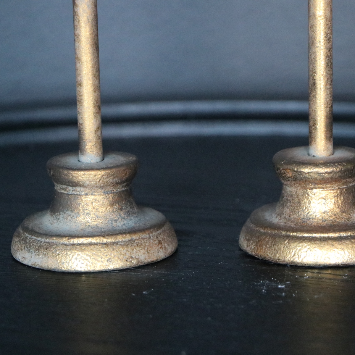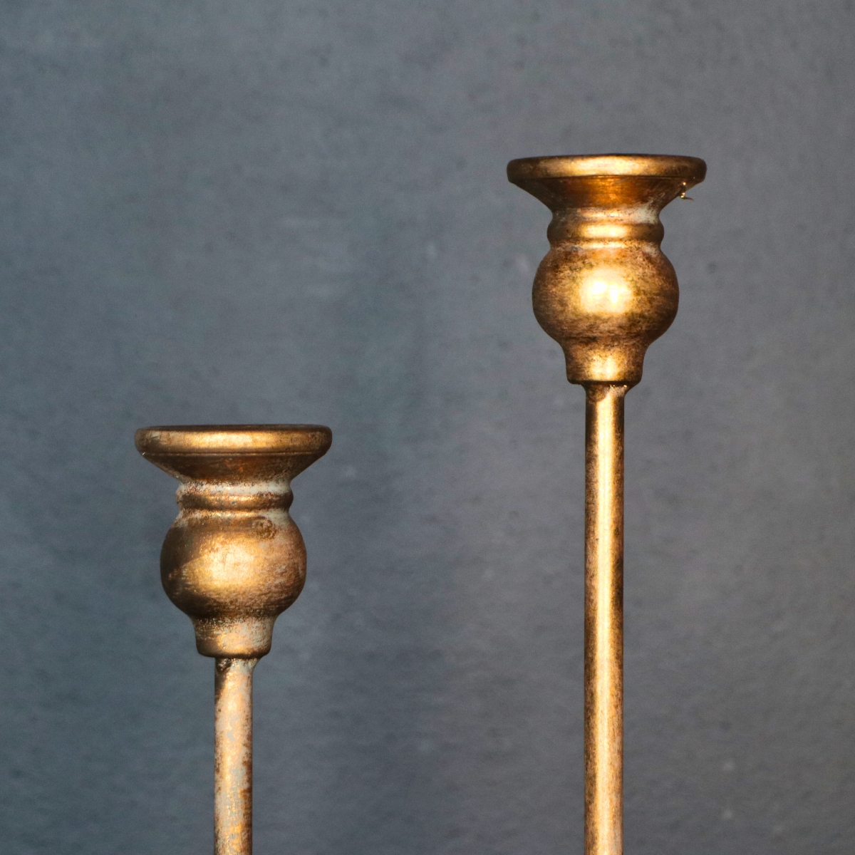 El set de candelabros Marianne presenta un diseño estilizado en metal dorado, ideal para aportar elegancia y calidez a cualquier ambiente. Su formato en dos alturas permite crear composiciones armónicas en mesas, arrimos o repisas, adaptándose a espacios clásicos o contemporáneos con un toque sofisticado.