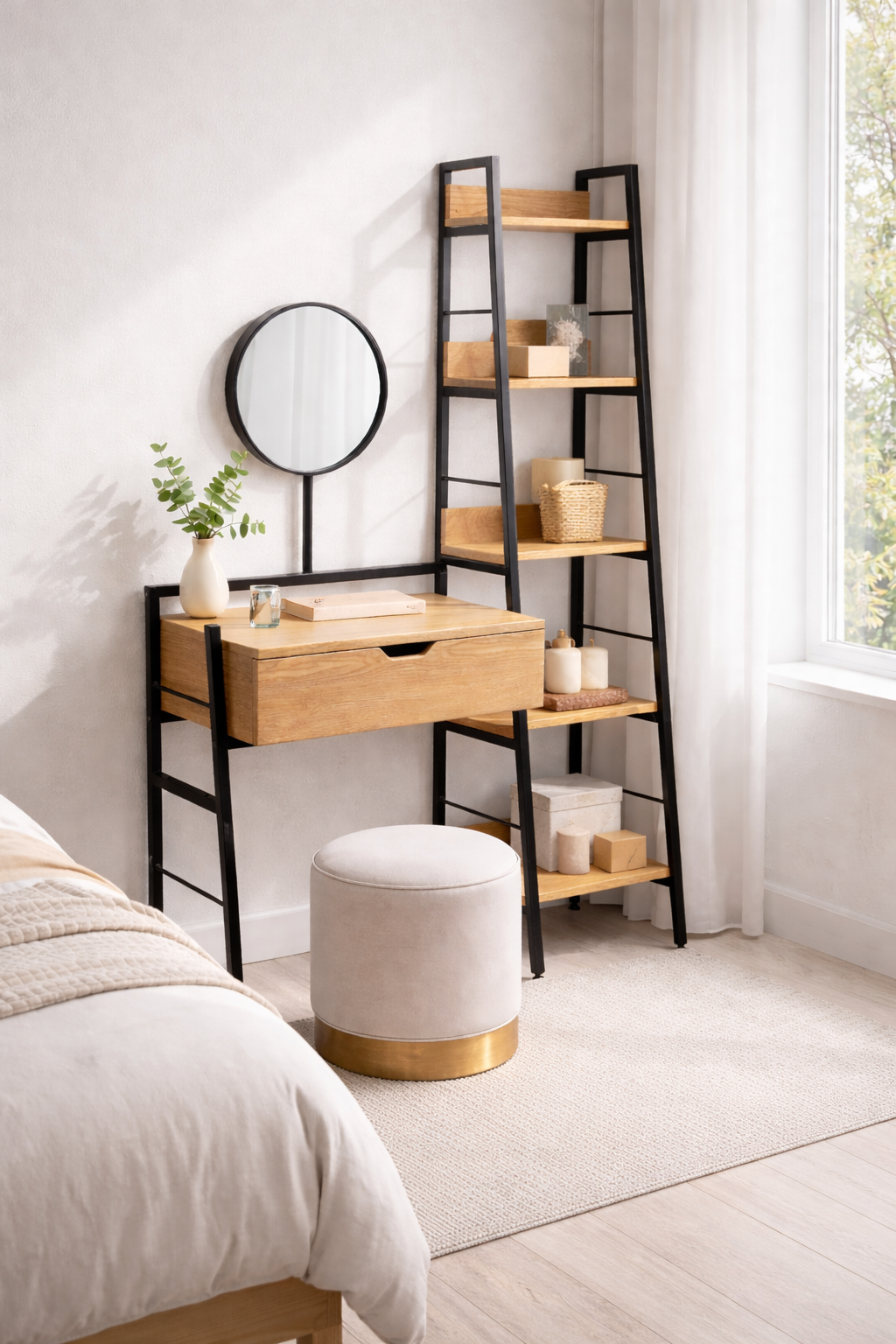 Su estructura de metal negro junto a superficies en madera aportan un equilibrio perfecto entre calidez y estilo contemporáneo, ideal para dormitorios, walk-in closet o espacios multifuncionales.